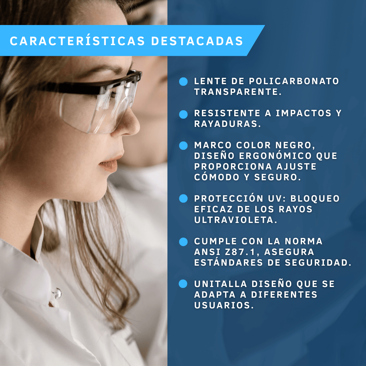El lente black frame con mica clara está fabricado en policarbonato resistente a impactos y rayaduras, ideal para protección ocular en entornos industriales, construcción y mantenimiento. Su diseño ergonómico unitalla brinda ajuste cómodo para uso prolongado e incorpora protección UV. Cumple con la norma ANSI Z87.1 para seguridad certificada.