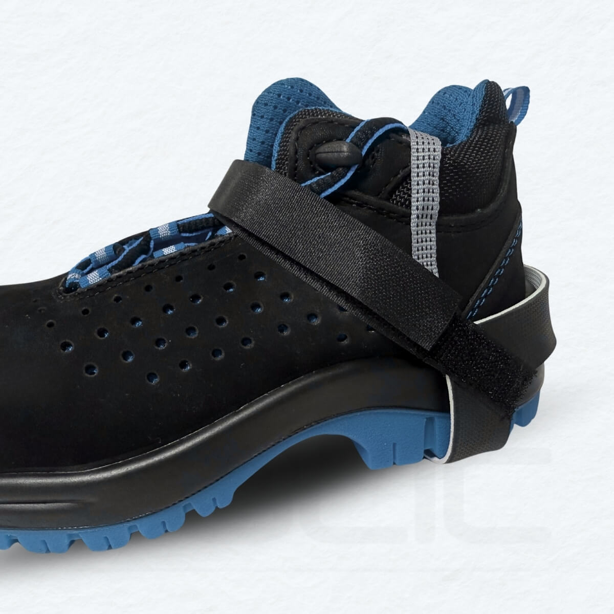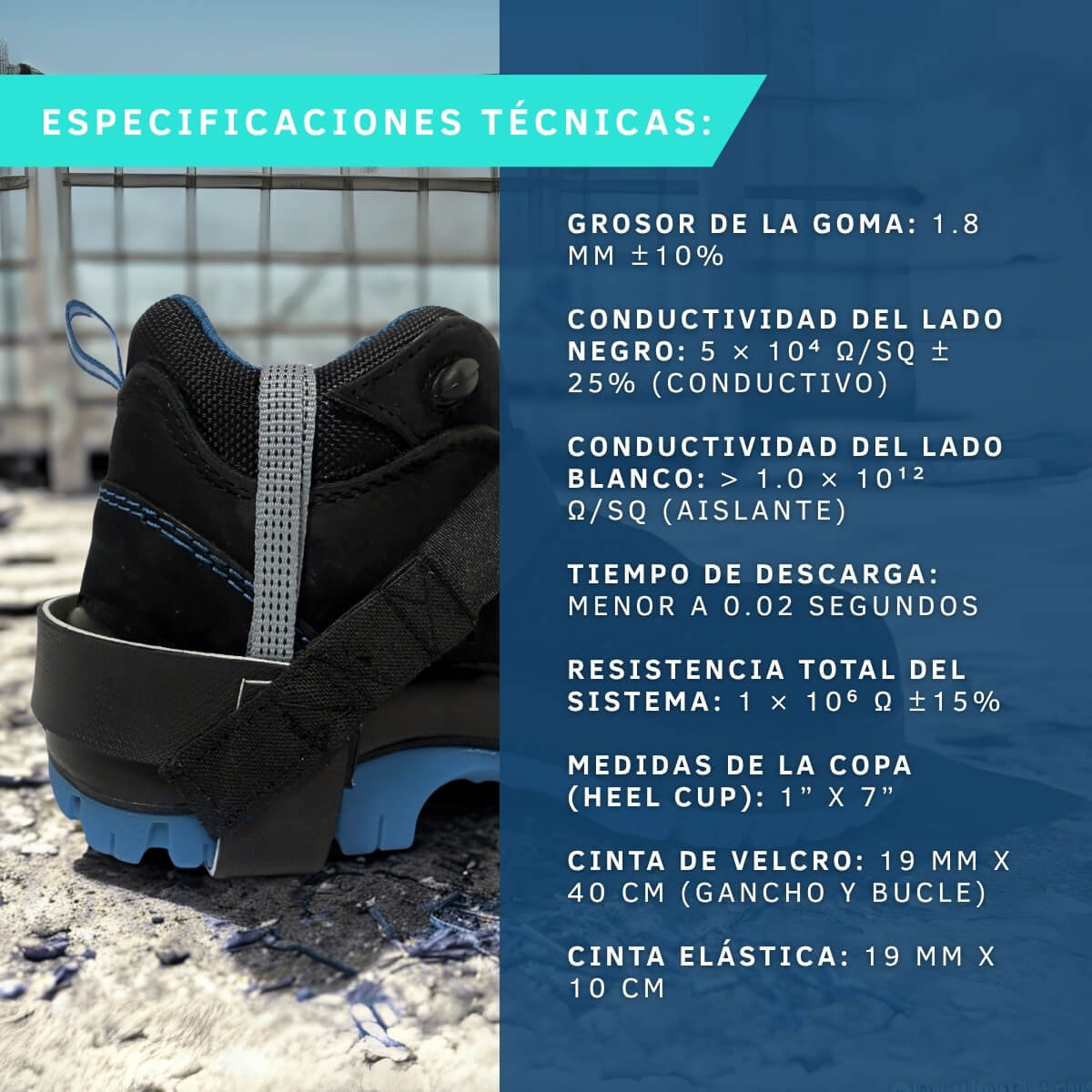 Talonera Antiestática ESD tipo Heel Grounder diseñada para proteger al personal contra descargas electrostáticas en entornos industriales. Incorpora resistencia de 1 megaohmio (1 MΩ) para una disipación controlada de la carga hacia piso conductivo. Fabricada con goma conductiva exterior y ajuste universal con velcro elástico. Cumple estándares internacionales ANSI/ESD. Ideal para líneas de producción electrónica, laboratorios y áreas sensibles energia estatica.